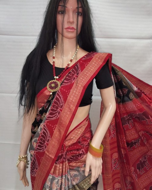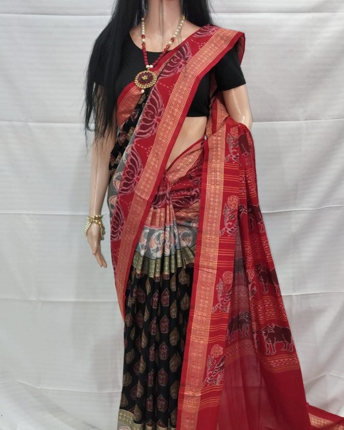 This Is Macha Border Sambalpuri Saree With Blouse Pices. Tha Colour Combination Is Black ,Red & Grey. Tha Saree Is Soft Cotton Sambalpuri Saree