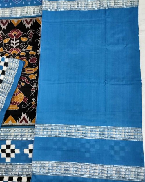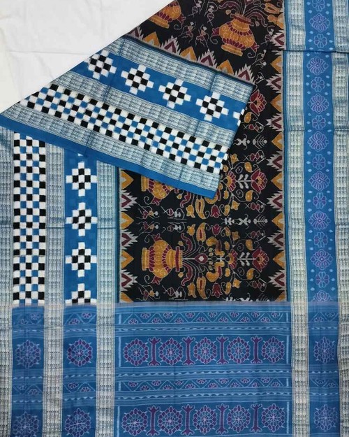 Tripal Border Safta Sambalpuri Saree With Blouse Pices. Dark Black & Sky Colour Combination Sambalpuri Border Safta Saree