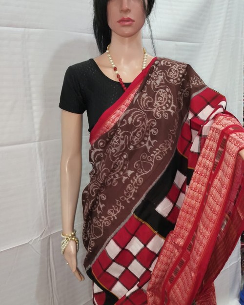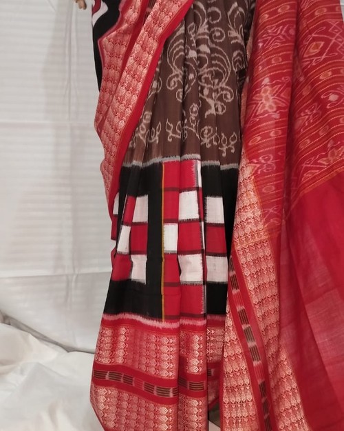 One Side Safta Macha Border Sambalpuri Saree With Blouse Pices. Dark Chocolate And Red Colour Combination Macha Border One Side Safta Sambalpuri Saree