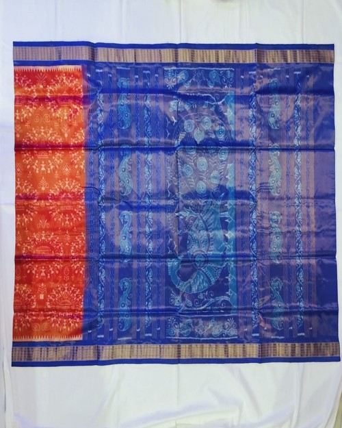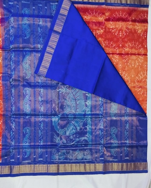 Sambalpuri Tisu Pata Saree With Blouse Red Blue Colour Combination