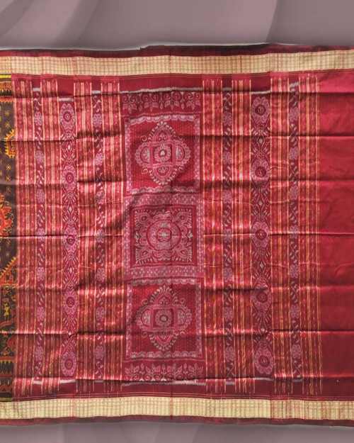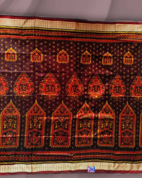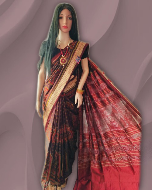 Sambalpuri Pata Saree With Blouse Coffee & Red Colour Combination
