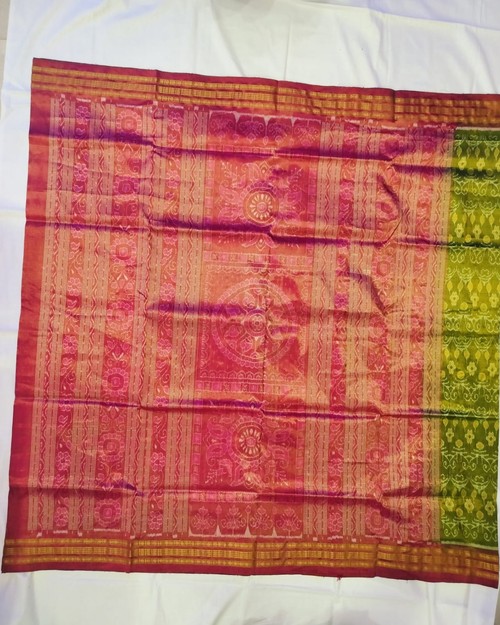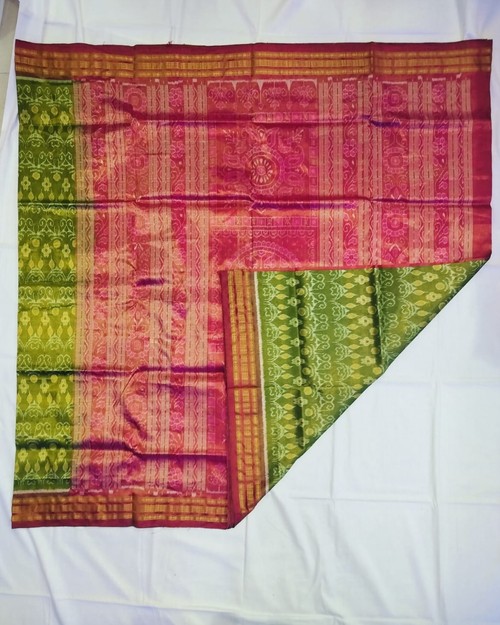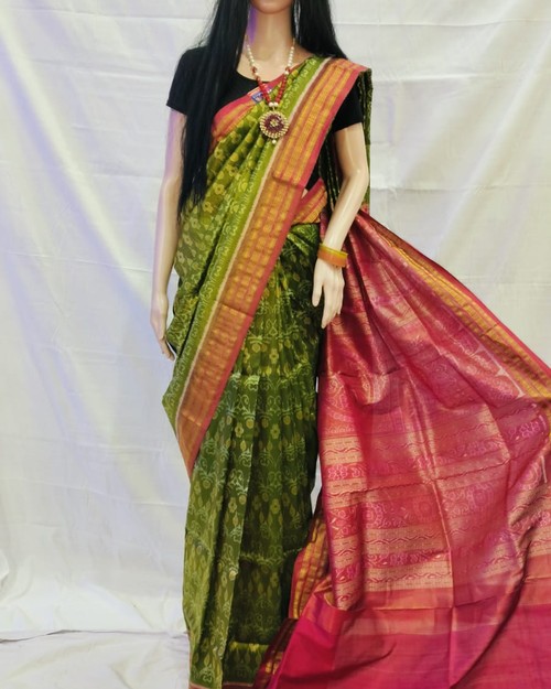 Sambalpuri Tisu Pata Saree With Blouse Pices Mehendi With Rani Pink Colour Combination
