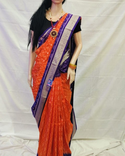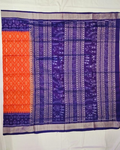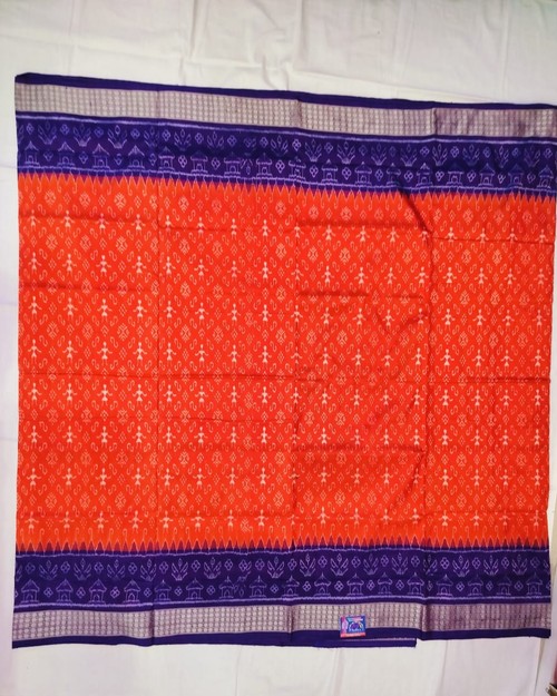 Sambalpuri Teracota Bandha Pata Saree Orange & Blue Colour Combination
