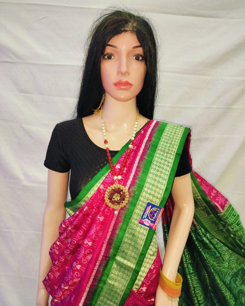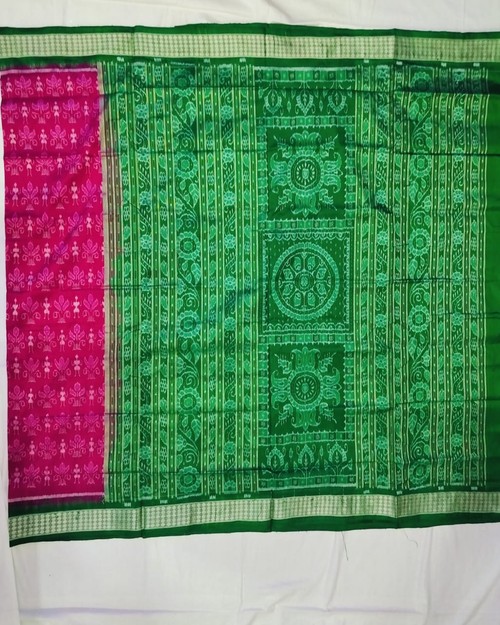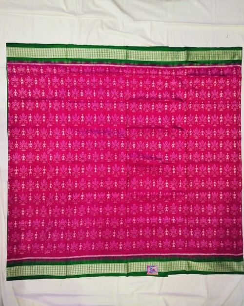 Sambalpuri Bandha Teracota Pata Saree Pink With Green Colour Combination