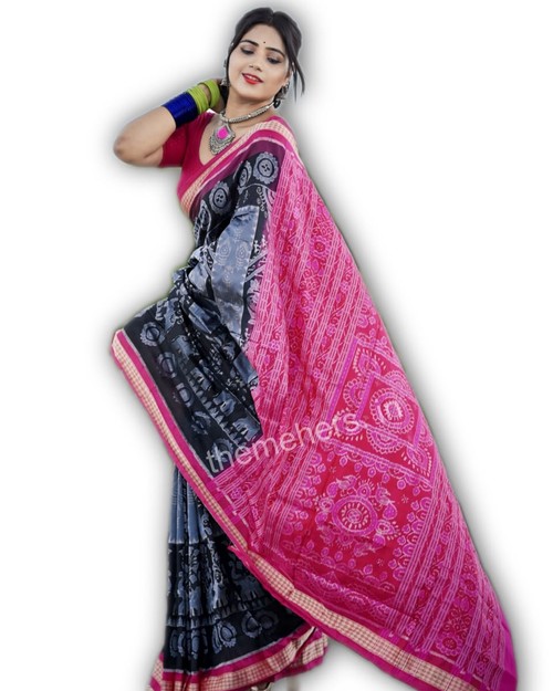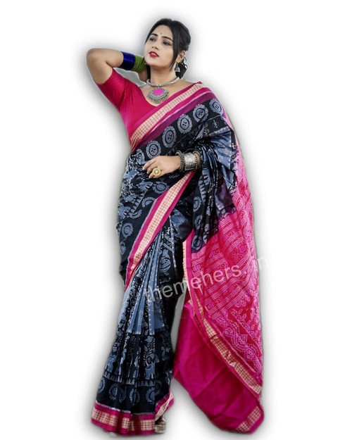 Sambalpuri Bandha Pata Saree. New Desing Sambalpuri Pata Saree. Black & Rani Colour Combination