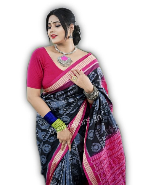 Sambalpuri Bandha Pata Saree. New Desing Sambalpuri Pata Saree. Black & Rani Colour Combination